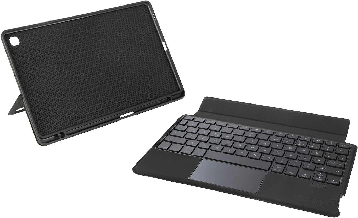 Hülle für Samsung Galaxy Tab S6 ite mit magnetisch abnehmbarer Tastatur und integriertem Trackpad. Vorderseite, Rückseite, Seiten und Ecken des Tablets werden durch eine weiche,